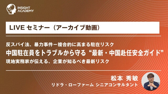 講師は、長年中国で生活し、日系企業に対してリーガルサポートを提供してきたローファーム所属の専門家。ニュースだけでは把握しにくい現地事情を踏まえ、中国の現在の様子を伝えるとともに、過度な不安に振り回されることなく、実務に即した安全管理の考え方をお伝えします。