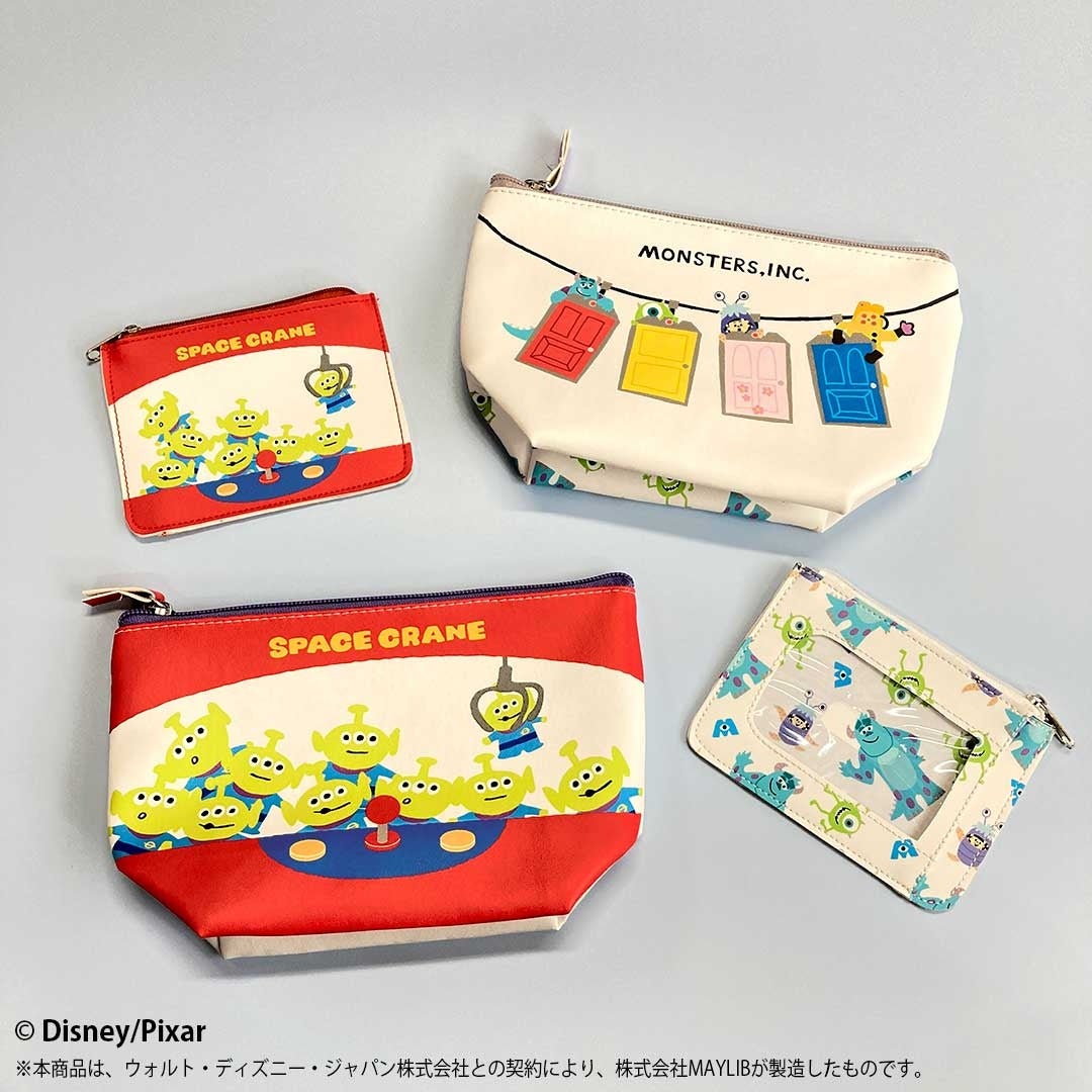 大容量のためコスメポーチやペンポーチとしてなどマルチに使える台形型のポーチは、「リトル・グリーン・メン」と『モンスターズ・インク』デザインで登場します。通学時に便利な、ファスナー付きパスケースも同デザインのため、セットで持ちたいアイテムです。