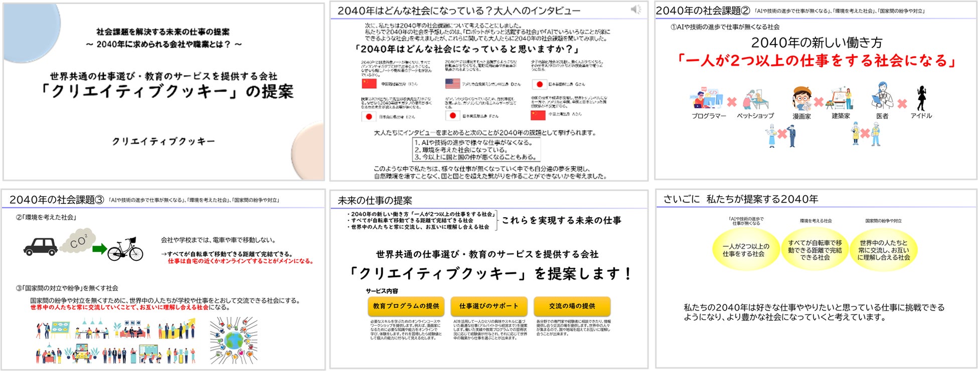 同チームは、2040年にはAIや技術の進歩により、1人が2つ以上の仕事をすること、環境に配慮した社会・国家間の対立を防ぐためにより尊重し合う社会になると予測。そのような社会での仕事選び・教育サービスを提供する会社「クリエイティブクッキー」を提案しました。