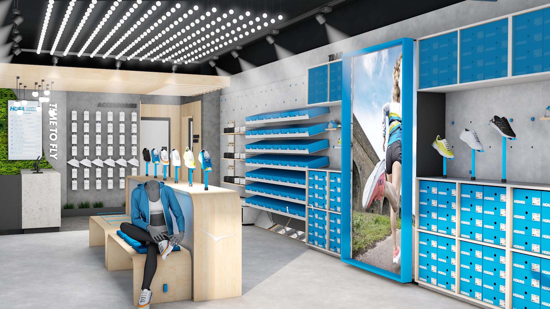 店内は、HOKAのブランドカラーである青空のようなブルーを基調に、温かみのある木目を取り入れた爽やかで落ち着いた空間です。取り扱い商品は、デイリーに使えるランニングシューズやハイクシューズ、ハットやソックスなどのアクセサリーを展開します。