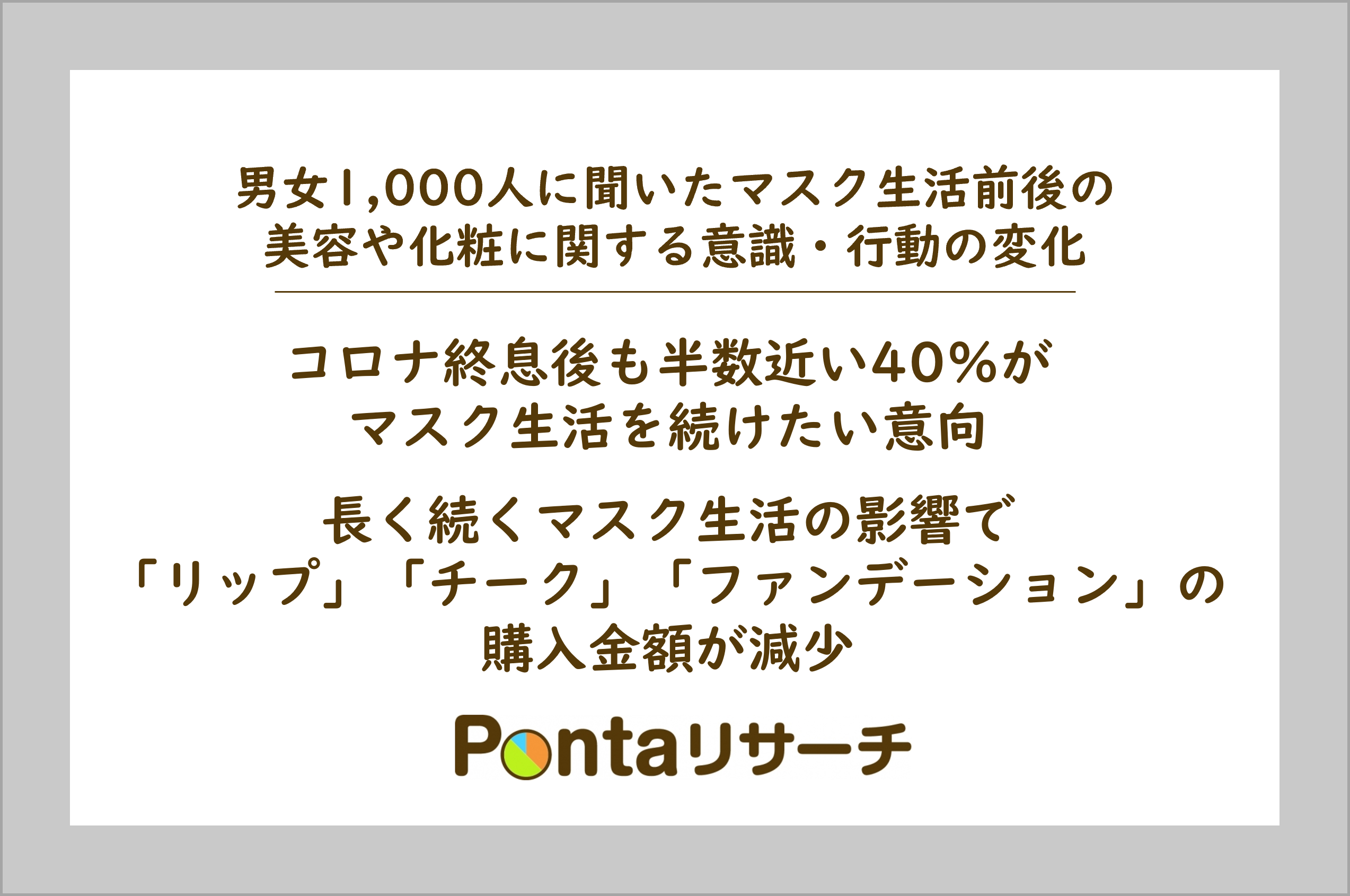 共通ポイントサービス「Ponta(ポンタ)」を運営する株式会社ロイヤリティ マーケティング(本社:東京都渋谷区、代表取締役社長:長谷川 剛、以下「LM」)は、コロナ禍でマスクを着用するようになる前とマスク着用が続く現在を比較して、美容・化粧への関心の変化や悩みを聴取した「美容に関する調査」(実施期間:2021年12月21日~12月24日)の結果をご報告いたします。