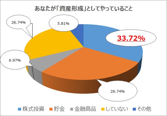 また、同時にアンケ―トをした「あなたが「資産形成」としてやっていること」については、「株式投資」が、最も多く、「貯金」を上回りました。「株式投資」「投資信託」の回答が多く、資産運用をされている方が多い結果となりました。オトナ世代は、資産運用として、貯金ではなく積極的に投資活動をしていることもわかりました。