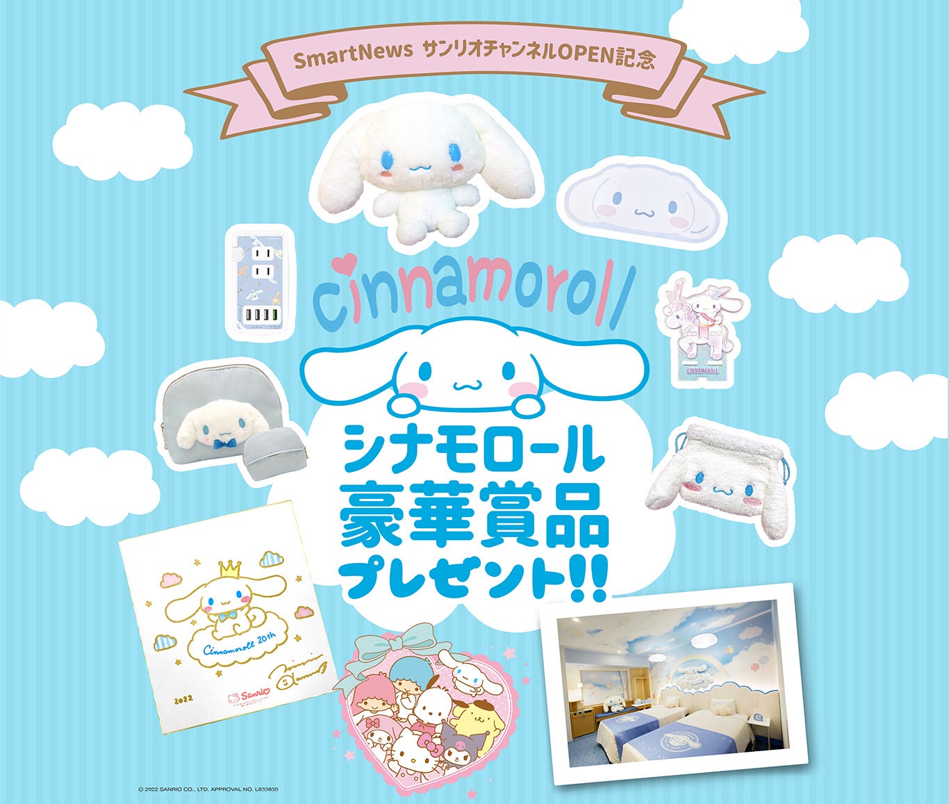 シナモロールが生まれた遠い空の雲の上をイメージした、アワーズイン阪急のシナモロール ルーム「空の部屋」無料宿泊券を3組様に 、または サンリオの無料会員アプリ「Sanrio+(サンリオプラス )」で景品やクーポンと交換できるスマイル(ポイント)を1,000スマイル、50名様に抽選プレゼントします。SmartNewsの「サンリオチャンネル」内にて開催。期間中何度でも抽選にご参加いただけて、その場で当選可否がわかります。