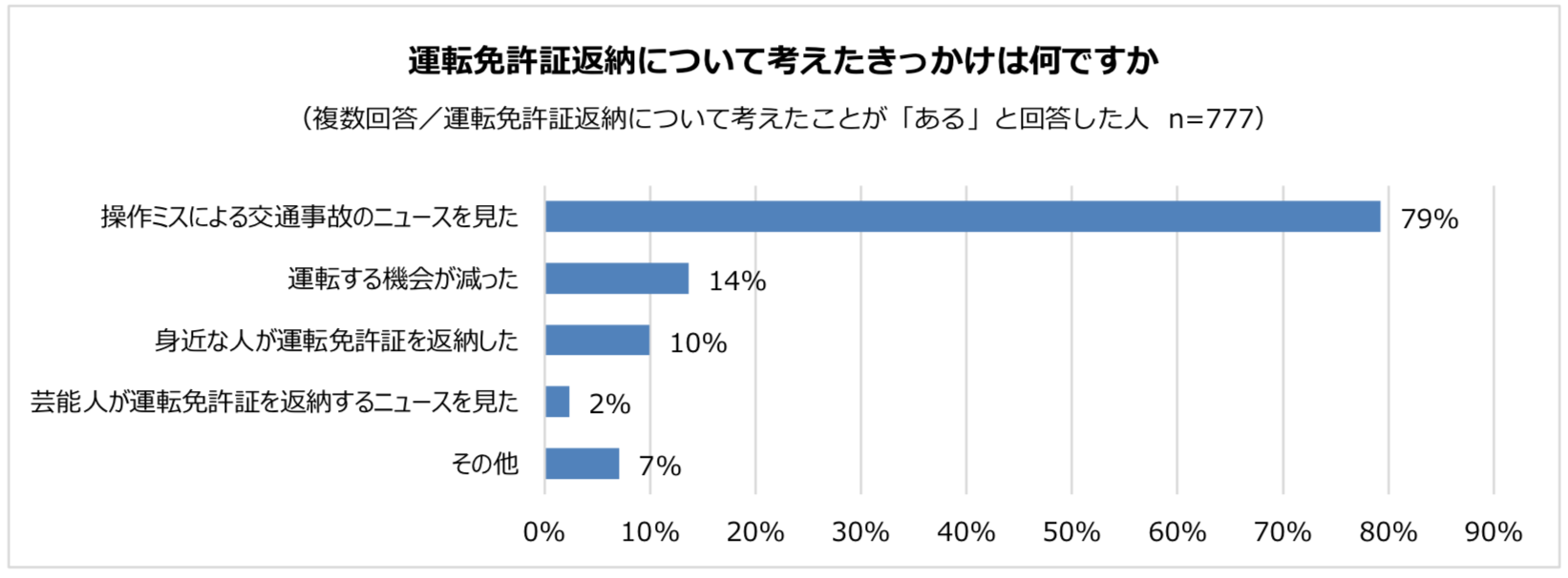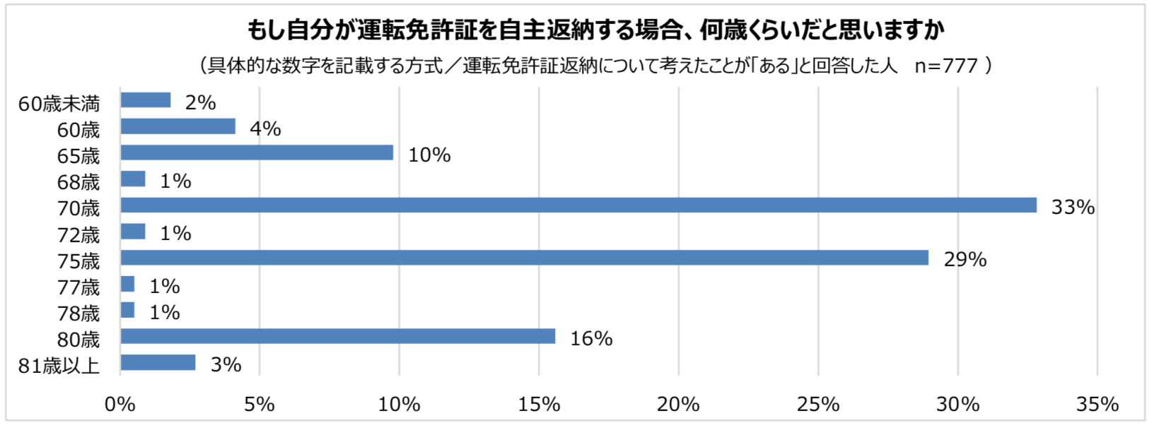 今回のアンケートでは、運転免許証の返納について自身が返納する場合の想定年齢と、身近で運転免許証を返納した人の年齢がどちらも70〜80代となりました。