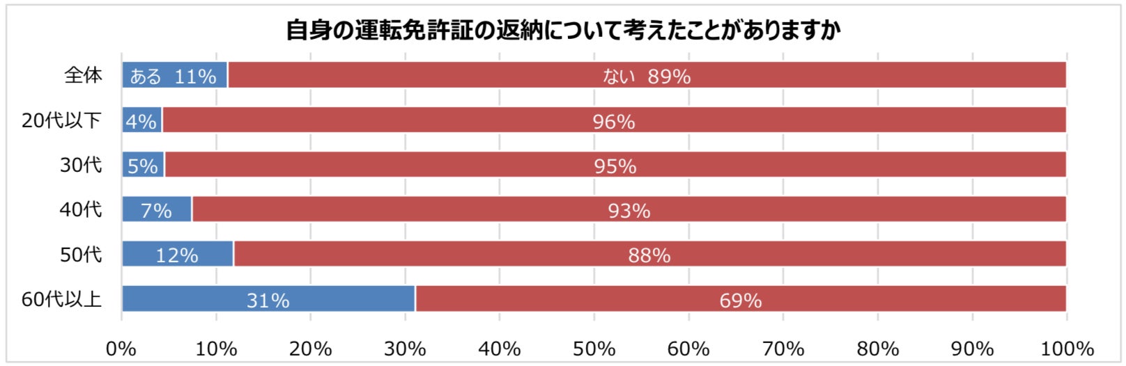 自身の運転免許証の返納について考えたことが「ある」と回答した人は11%でした。年代が上がるにつれて返納について考えたことがある割合が高くなっており、60代以上は考えたことが「ある」と回答した人が約3割でした。