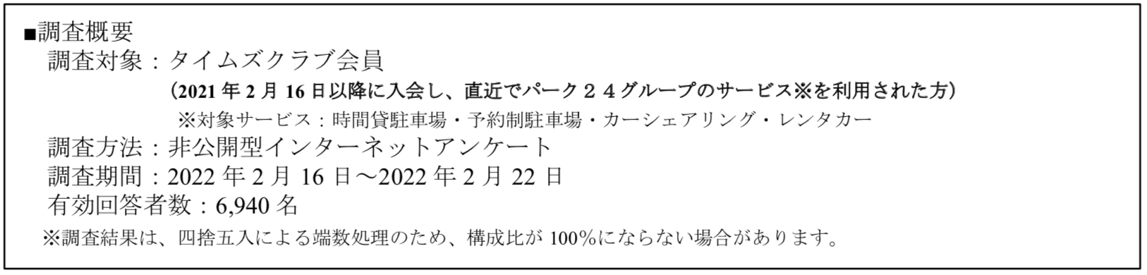 なお、本アンケートは、駐車場やカーシェアリング、レンタカー等のクルマに関わるサービスを利用した方々を対象としたものです。