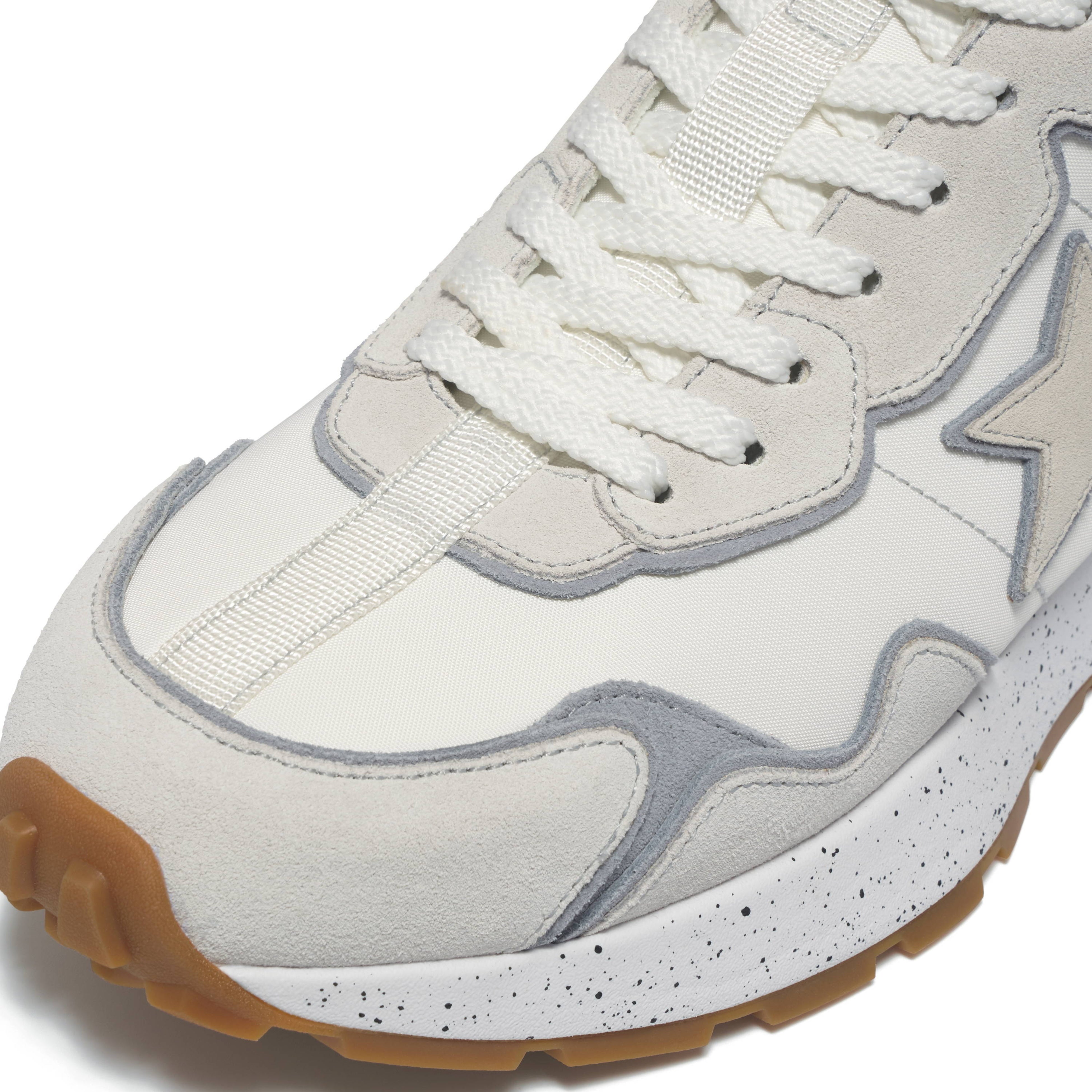 ホワイトはグレーのSTAロゴとガムソールがロゴが全体を引き締め、