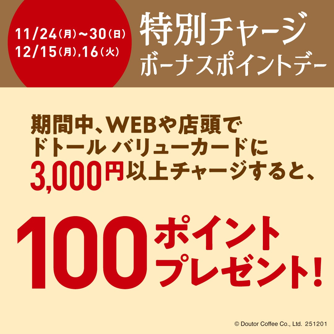 また、11月24日(月)~30日(日)、12月15日(月)、16日(火)の期間、「特別チャージ ボーナスポイントデー」を開催します。ドトール バリューカードを使って、お得なキャンペーンにぜひご参加ください。
