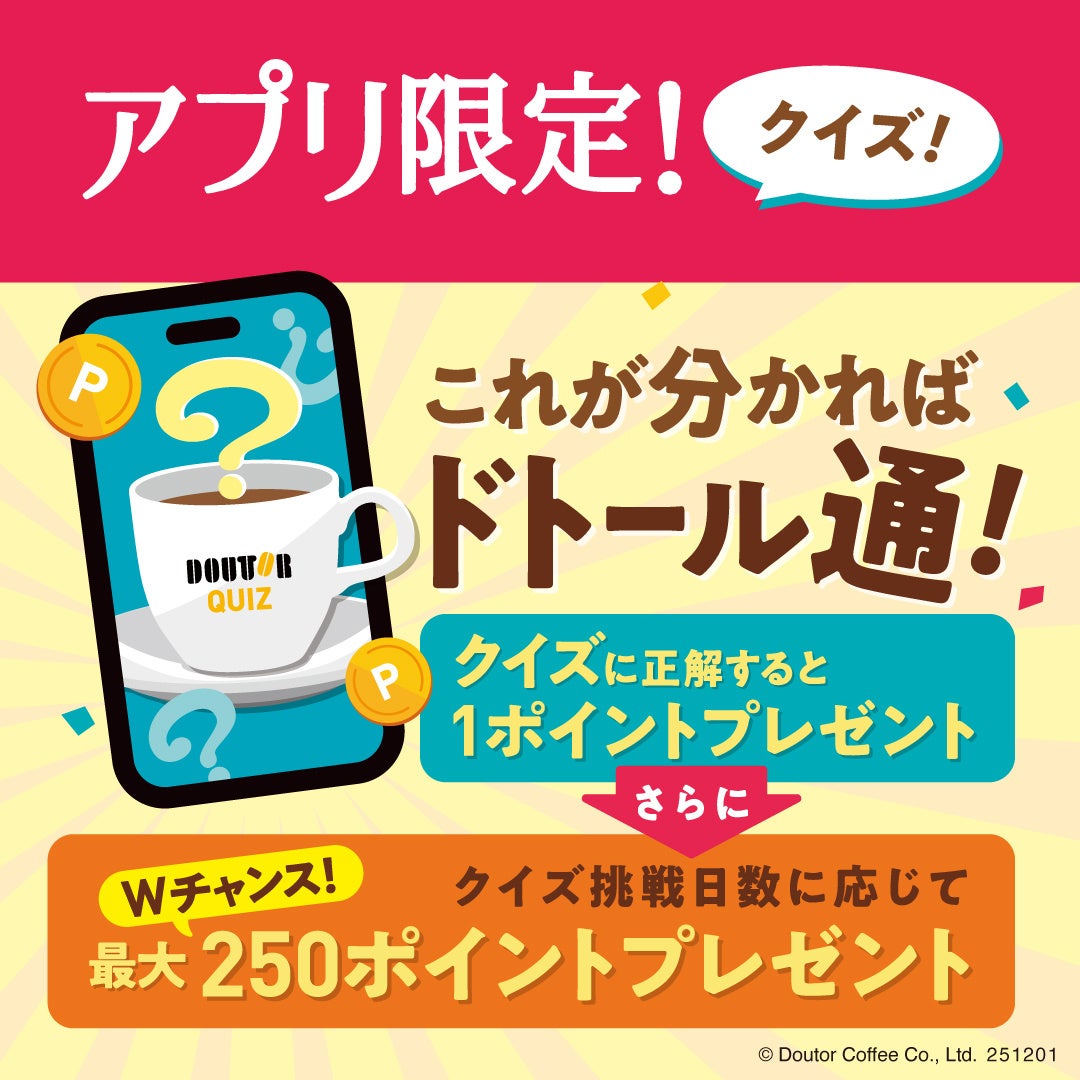 2025年12月1日(月)~12月31日(水)の期間中、ドトール バリューアプリ限定のドトールグループに関するクイズに挑戦し、正解すると1ポイントをプレゼントします。さらに、Wチャンスとしてクイズ挑戦日数に応じて最大250ポイントをプレゼントいたします。
