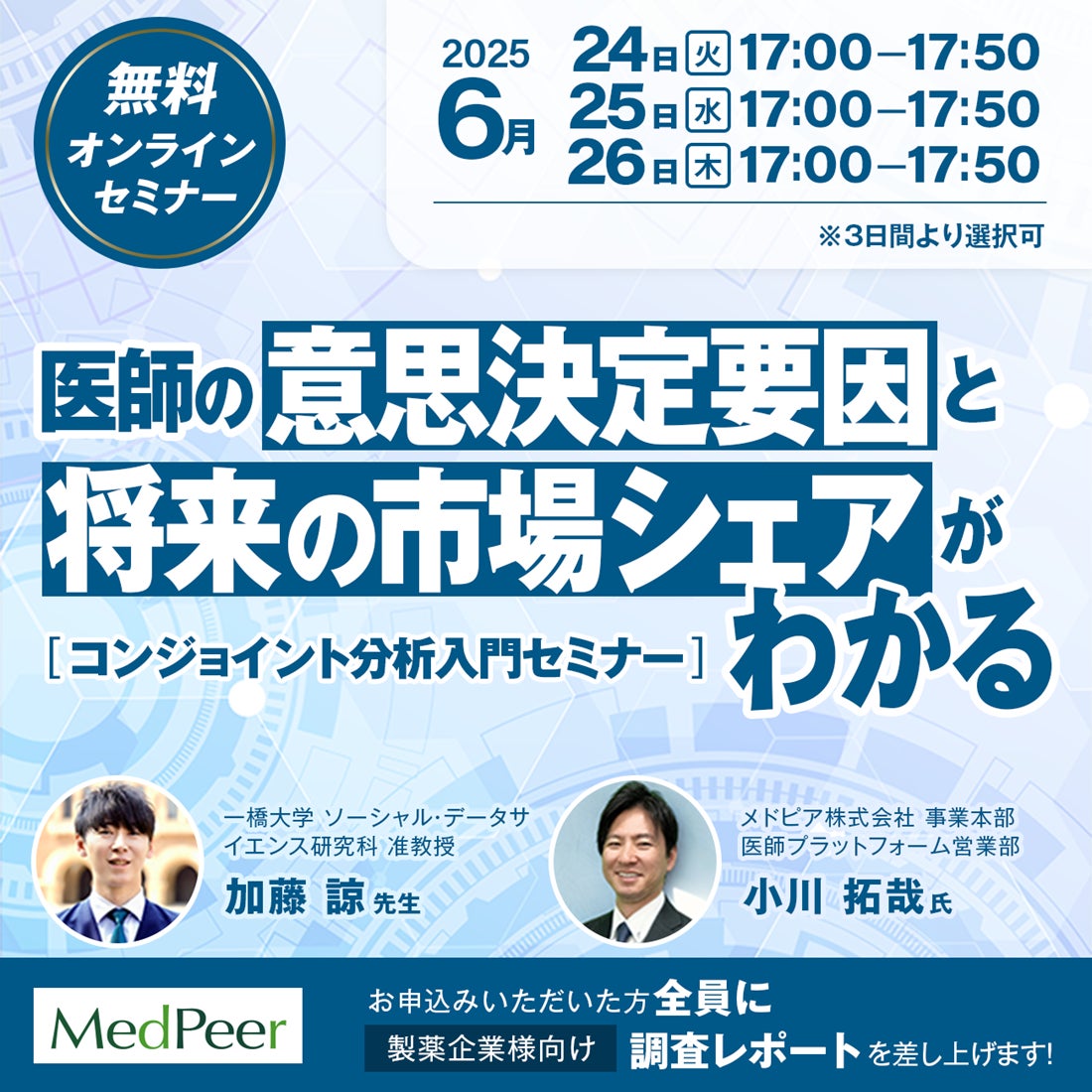 メドピア株式会社(東京都中央区、代表取締役 兼 執行役員社長 CEO:後藤 直樹、以下メドピア)は、薬剤が医師や患者に選ばれる理由や市場シェアを予測するための手法である「コンジョイント分析」の製薬企業様向け入門セミナーを6月24日、25日、26日にオンラインで開催します。