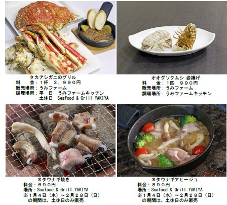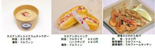 カニ味噌がたっぷりつまったタカアシガニや、見た目からは想像がつかない食感のヌタウナギ、オオグソクムシは生きた姿をそのままお召しあがりいただけます。そのほか、タカアシガニの身を使ったクラムチャウダーや特製サンド、深海エビのからあげも販売いたします。