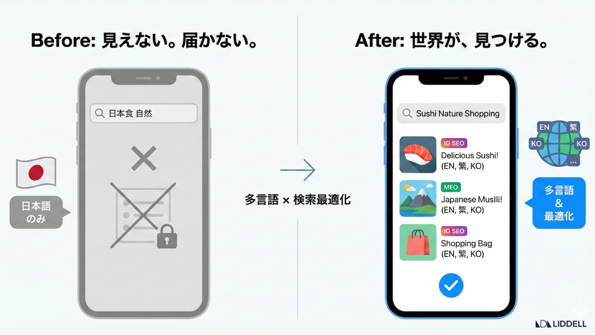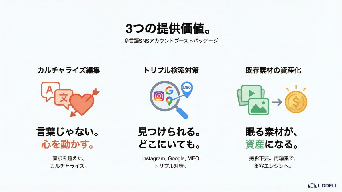 本パッケージは、既存の素材(写真・動画)を再活用し、「多言語コンテンツ制作」×「検索最適化(Instagram SEO / Google MEO)」を一括で行うことで、情報の壁をなくし、確実な集客へと繋げます。