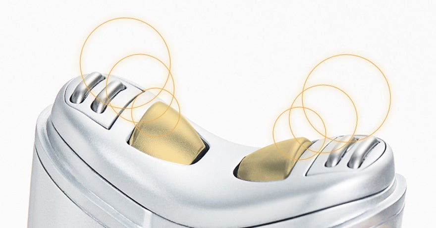 130度の角度がついたV字ヘッドが 顔の凹凸にしっかりフィット。両端の電極がしっかり当たって効率的なケアを実現します。