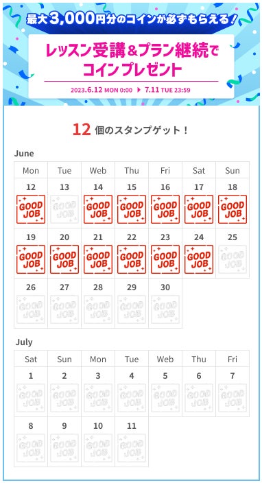 英語を習得するには継続的に学習することが非常に大切です。ネイティブキャンプでは会員の皆さまが英語学習を続けられるよう、日々コンテンツ作成・新機能開発に取り組んでいますが、毎日楽しみながらレッスンを受講していただきたく、レッスン受講&プラン継続でコインプレゼントキャンペーンを開催いたします。
