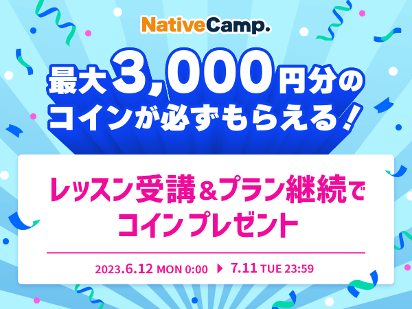【オンライン英会話No.1】ネイティブキャンプ 最大3,000円分のコインが必ずもらえる!レッスン受講&プラン継続でコインプレゼントキャンペーン開催!