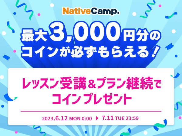 ネイティブスピーカーと回数無制限のオンライン英会話サービス「ネイティブキャンプ英会話」を展開する株式会社ネイティブキャンプ(東京都渋谷区 代表取締役:谷川国洋)は、レッスン受講&プラン継続でコインプレゼントキャンペーンを開催いたします。