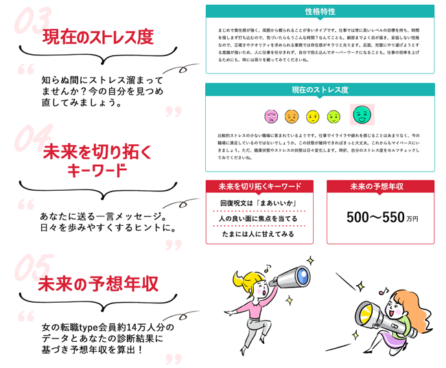 「ワタシの未来診断」では、エニアグラムなどの学術的な心理尺度を用いて、性格特性や現在のストレス度を判定します。また、女の転職type会員の中から抽出した約14万人分のデータに基づき、未来の予想年収を算出。最適な仕事についてもご提案します。自分に向いている仕事がわからない、今の仕事にモヤモヤしている、簡単に自己分析したい、という女性におすすめの診断テストです。会員登録すれば無料で受けることができるので、ぜひお気軽にお試しください!