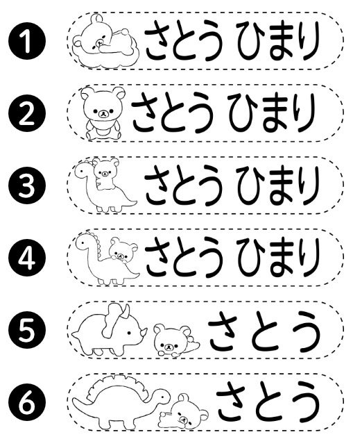 「リラックマベビー もちものスタンプロング」のイラストはこちらの6種類。赤ちゃんリラックマや、きょうりゅうと戯れるイラストは、見ているだけでおもわずクスッと笑顔になること間違いありません。
