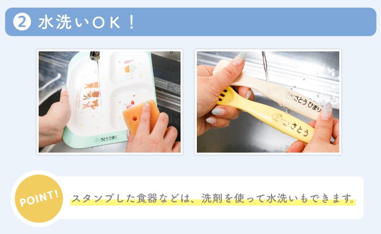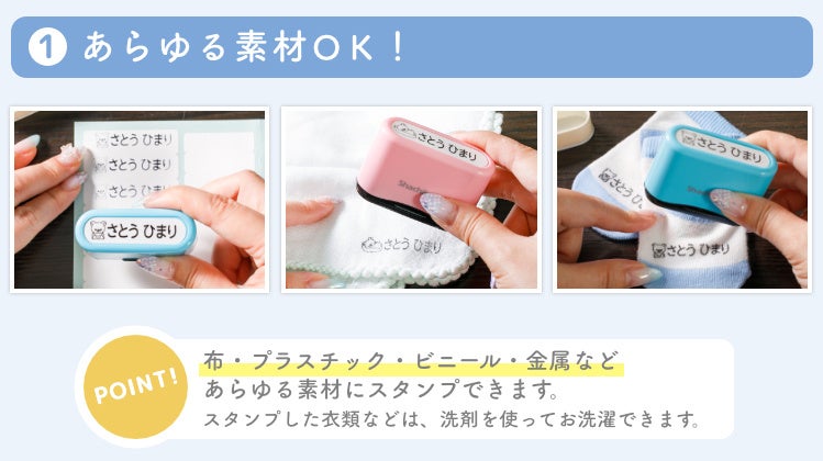 「リラックマベビー」のかわいいイラストが目じるしになって、自分のもちものを教えてくれるスタンプは、布やプラスチックなどあらゆる素材にスタンプOK。耐水性インクを使っているため、洗濯や洗い物にも落ちにくいのが特徴です。