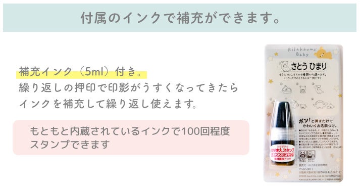 リラックマファンにはたまらない、とってもかわいい専用パッケージに入れてお届けします(10cc入り補充インク1本つき。1回の補充で100回程度のスタンプができます)。