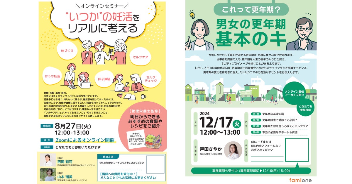 福利厚生サービス「ファミワン」は、「専門家によるセミナー/研修を通じての従業員のリテラシー向上や社内風土の醸成」、そして「オンライン健康相談による従業員個々のサポート」の両側面から、企業の健康経営や両立支援の促進、女性活躍推進を支援します。
