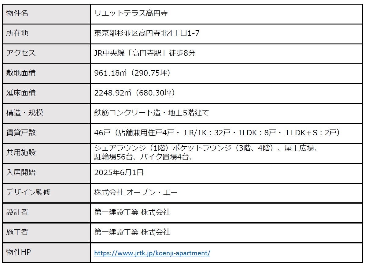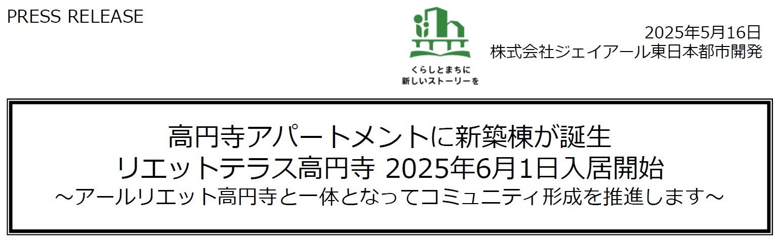 株式会社 ジェイアール 東日本都市開発 東京都渋谷区 代表 取締役 社長 根本 英 紀 は 、 JR 中央線高円寺駅 ・ 阿佐ヶ谷駅間に位置する馬橋エリアにて 「 リエットテラス高円寺 」 以下 「 LT 高円寺 」) を 開発し 、 2025 年 6 月 1 日より 開業 ・ 入居開始することをお知らせ いたします 。