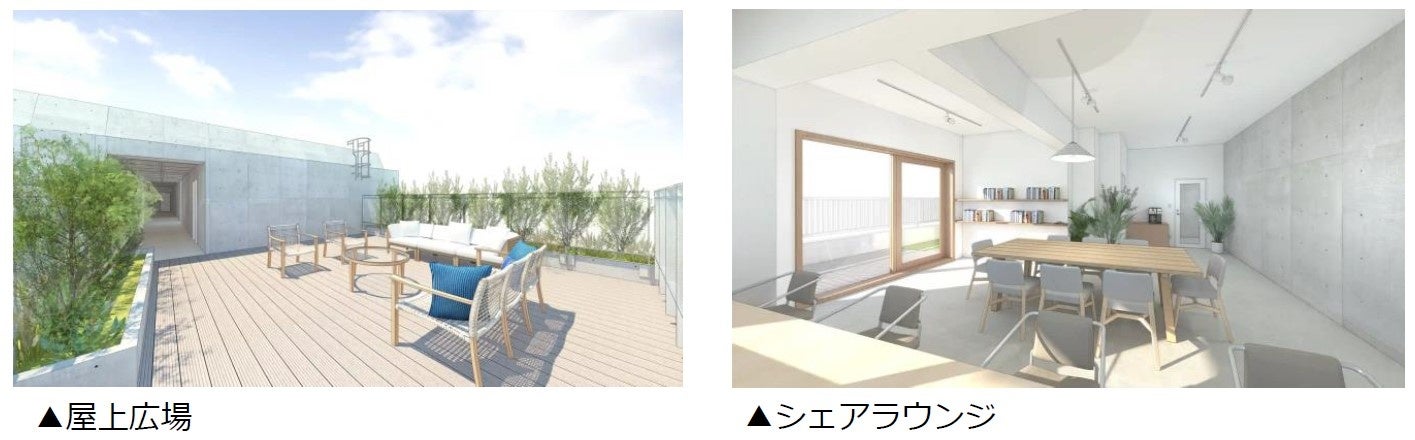 仕事や交流スペースとして利用できるシェアラウンジ、ポケットラウンジ、屋上広場等の共用部が