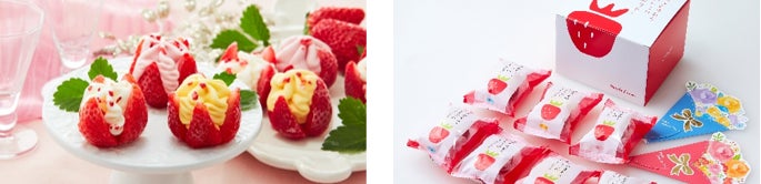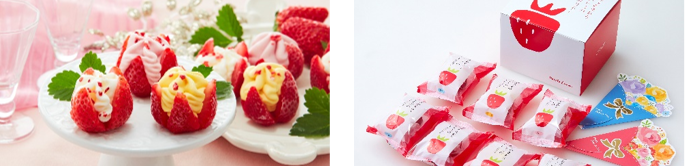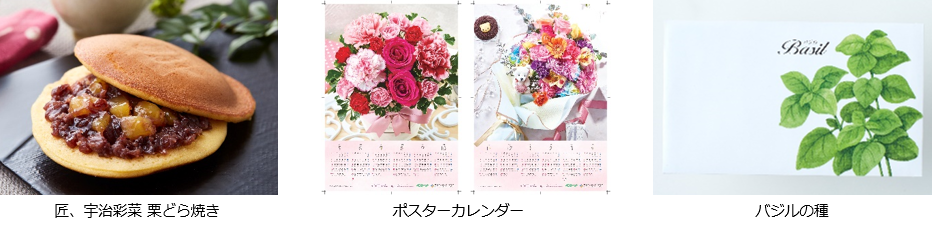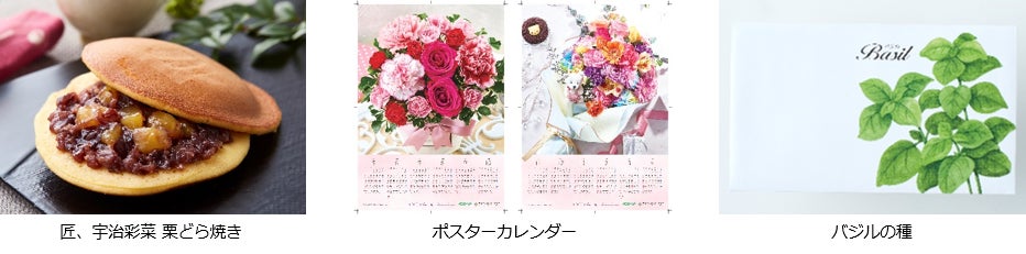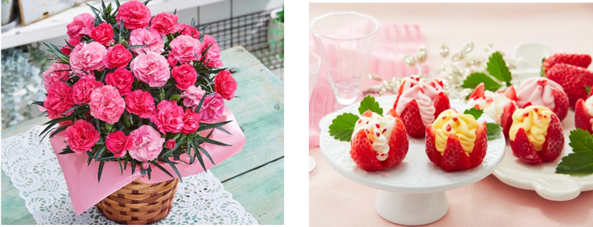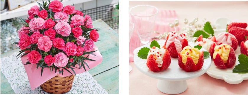 毎年大好評の「カーネーション」は、今年新色を追加し全8種類にて登場。さらに、本品購入者全員に7大特典をプレゼントします。京都に本店を構える「匠、宇治彩菜」の栗どら焼きや、お花のポスターカレンダーなど、うれしい特典付きギフトです。新商品の「博多あまおう 花いちごのアイス」は、お花のようにカットされたいちごにアイスが入ったお菓子ギフト。華やかな見た目のアイスは、母の日に贈るプレゼントにおすすめです。