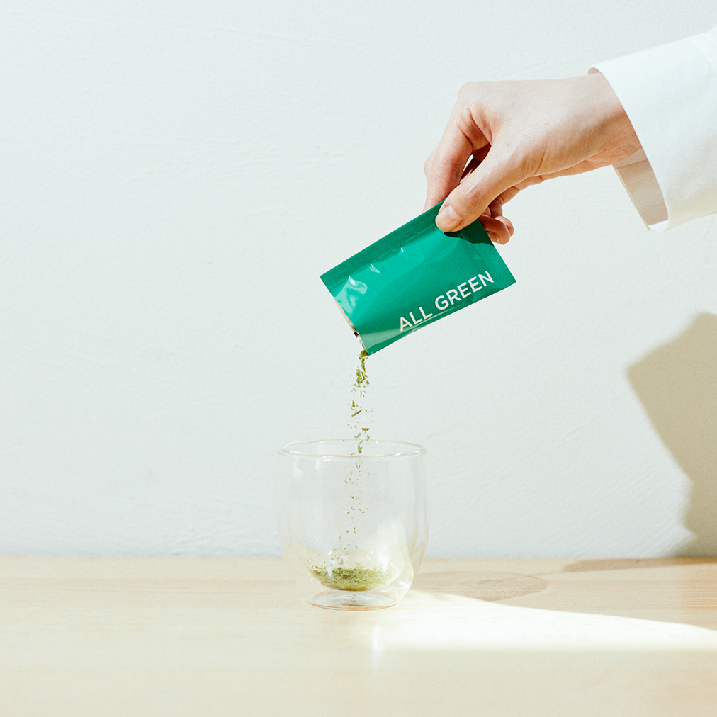 ALL GREENは緑茶の茶葉が持つ“野菜と同等以上の栄養”に着目した、新しいカタチの緑茶です。美味しさを損なわない独自の「ソリュブル・リーフ製法(特許出願中)」で茶葉をまるごと顆粒化。厳選したシングルオリジン・ティーの味わいをまるごと楽しみながら、日々の野菜不足の不安を解消できる、まったく新しい健康習慣を提供します。