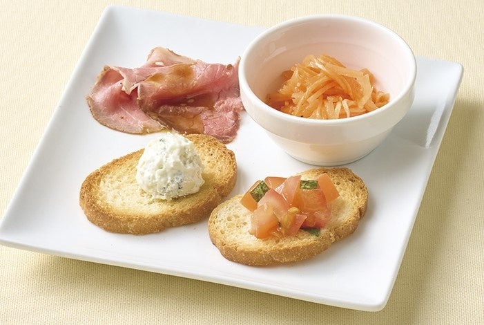 キャロットラぺ、ローストビーフ、ゴルゴンゾーラクリームのカナッペ、トマトのカナッペの味わいが異なる4種のオードブル。少しずつ色々なメニューを楽しみたい方にぴったりです。