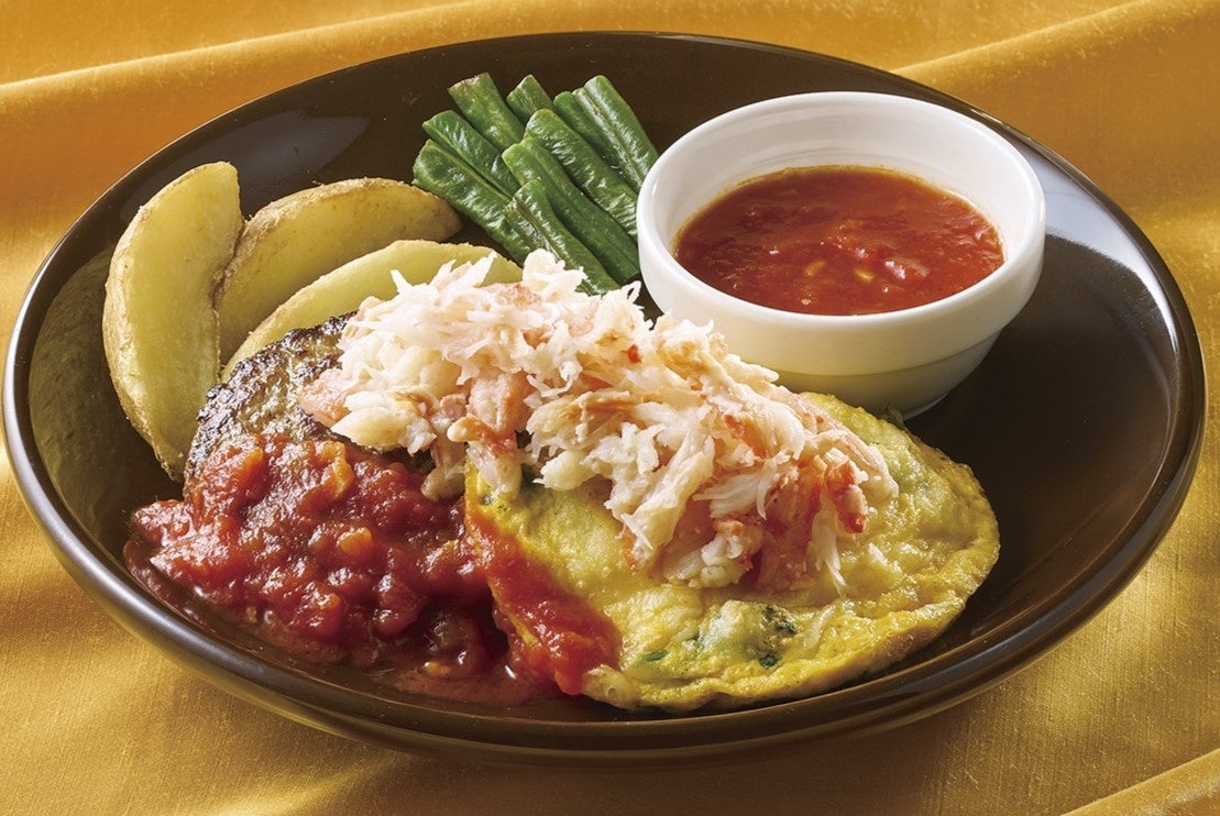 ふっくらジューシーな合い挽きハンバーグに、とろ~りたまごのオムレツを添え、ぷりぷり食感のたらば蟹をトッピングした逸品。