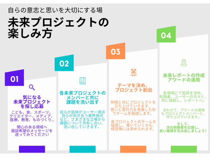 これまで医療、科学、スポーツ、車、イノベーション、金融、ちいき、経営、こども、クリエイター、食、地球、美容、日常、メディア、仕事、ものづくり、安全、教育、ラグジュアリー、家族をテーマに、21の未来PJを創出してまいりました。また、2023年2月までに30の未来プロジェクトとメディアの立ち上げを目指してまいります。