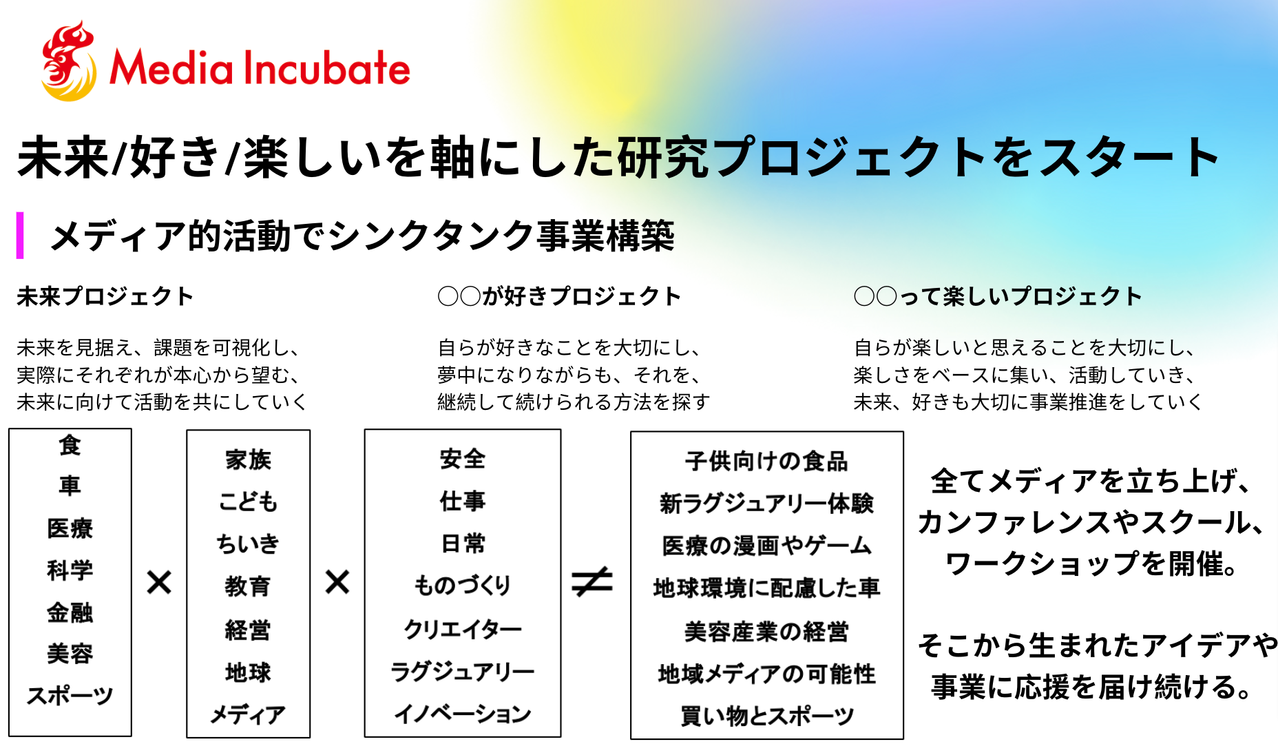 メディアインキュベートは、メディアのアップデートを志し、メディアの事業開発と、メディアで事業開発を⾏っております。スタートアップ、業態転換や再編のための投資と⼈材、組織⾯のサポートを実施します。