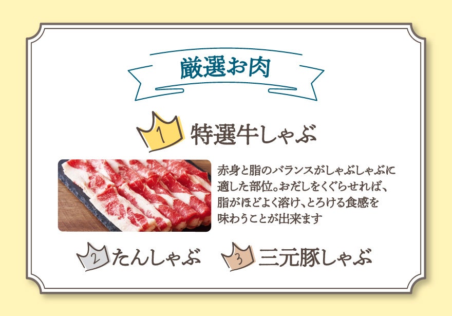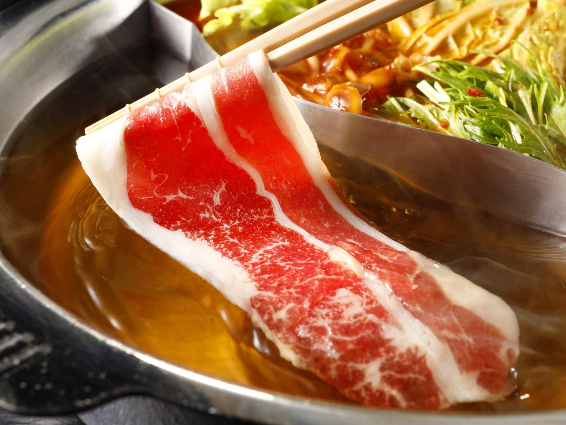 プロの目利きが選び抜き、厳しい生産管理のもとで自社の基準をクリアしたお肉のみを使用。それぞれのお肉を一番美味しい状態でご提供するためにミリ単位で厚みにこだわり、お店で1枚1枚カットすることで、とろけるしゃぶしゃぶ体験を実現しております。