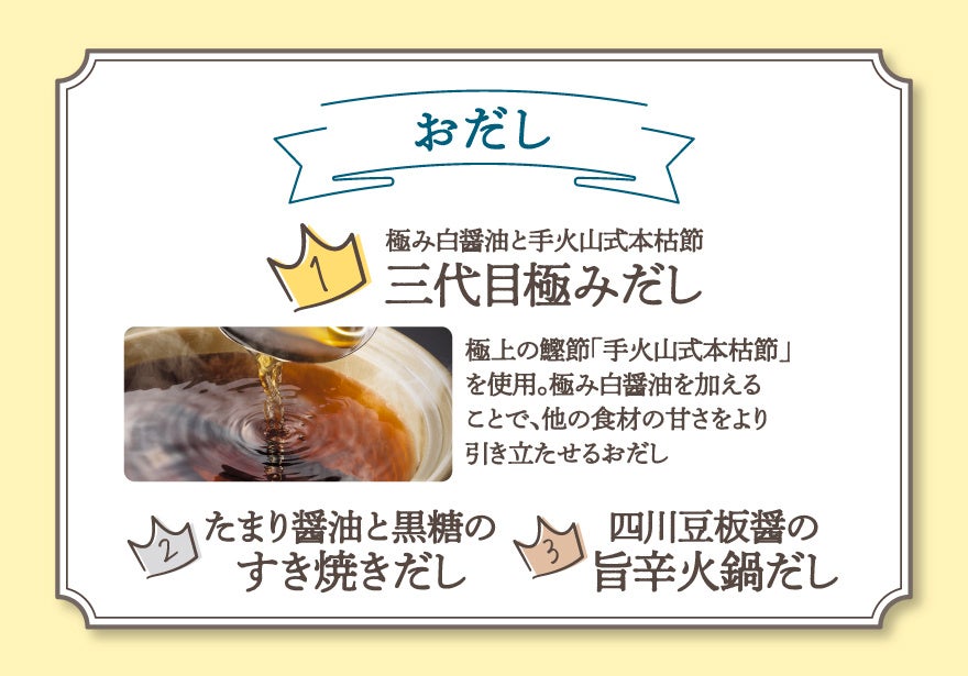 3種の魚介だしに素材の甘さを引き立てる「極み白醤油」と、熟練の職人が手で熱を測り火力を調整し、3カ月かけて鰹の旨みを凝縮した「手火山式本枯節」を加えました。お肉や野菜本来の旨味を引き出しつつ、繊細な鰹の風味が広がります。