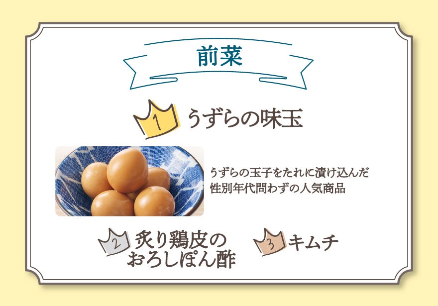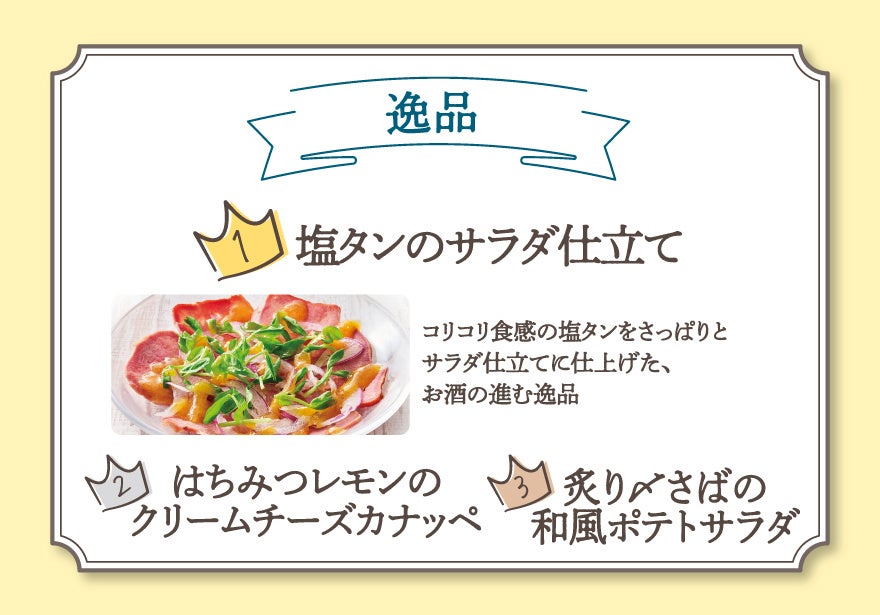 各カテゴリーのランキングはほぼ同じですが、「前菜・逸品」では「はちみつレモンのクリームチーズカナッペ」が人気ナンバーワンに!お食事の合間に嬉しい、デザート感覚のおつまみです。