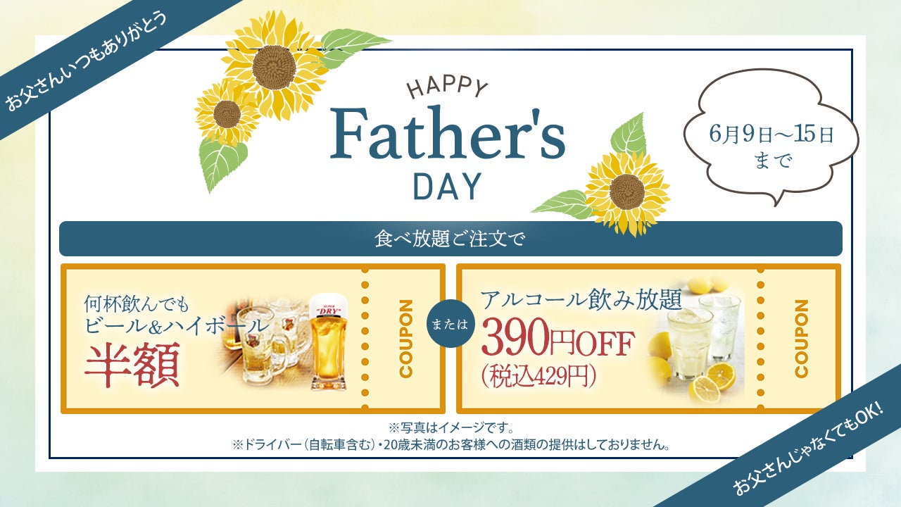 2025年6月9日(月)~15日(日)の間は、温野菜公式アプリの「父の日クーポン」画面をお店でご提示いただいたお客様に「ビール&ハイボール半額クーポン」「アルコール飲み放題390円(税込429円)OFFクーポン」をご用意しております。※ちなみにお父さん以外もご利用いただけます。