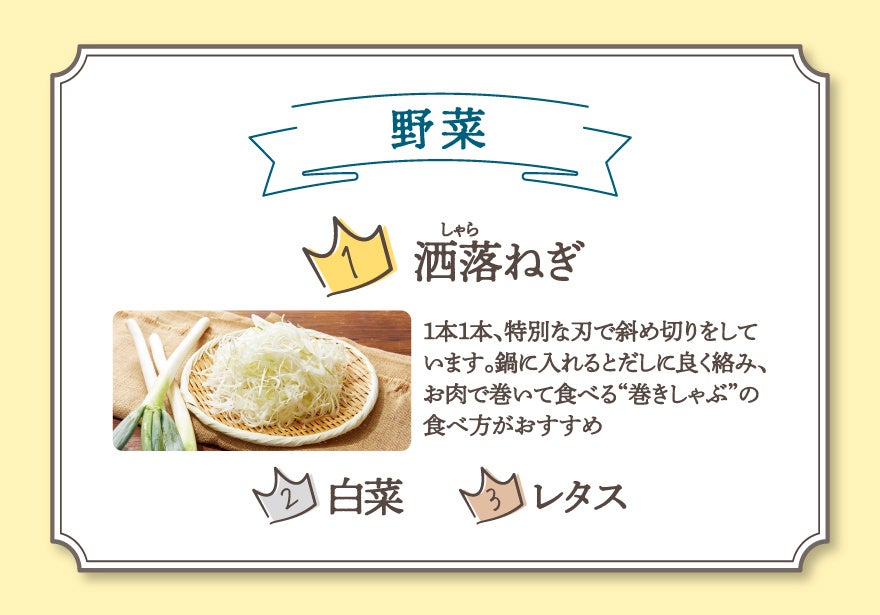 “しゃらしゃら”と音が出そうなほど繊細な「しゃぶしゃぶ専用」カット。お肉で巻いて食べると口の中でおだしと肉の旨みがたっぷりと広がります。