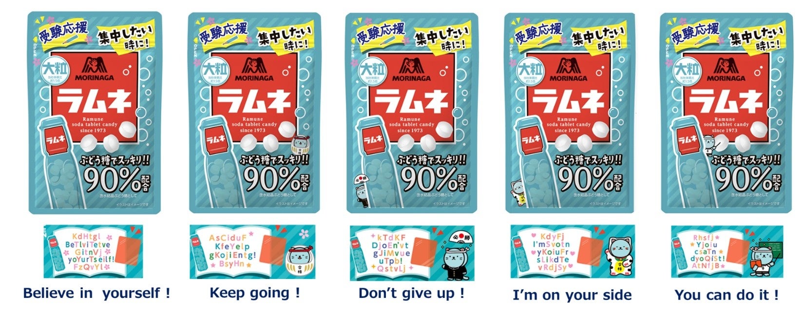 「森永ラムネ」は、おやつだけでなく仕事や勉強で集中したい時・リフレッシュしたい時等、幅広いシーンでお楽しみいただいており、「集中したい時」が多い受験生にもご愛用いただいています。受験勉強の佳境を迎えるこの時期に、「森永ラムネ」シリーズを勉強のお供として、考えるためのエネルギー補給や気分転換にお楽しみいただきたいという思いから発売に至りました。さらに「大粒ラムネ」では、今年も受験生を応援するメッセージが隠されたパッケージの仕掛けがお楽しみいただけます。「森永ラムネ」シリーズにより、受験生を応援するとともに、お客様に笑顔をお届けしてまいります。