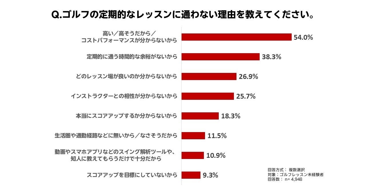 ・ゴルフレッスン未経験者がレッスンの受講をためらう理由の1位は「コストパフォーマンスが分からない」、2位は「時間的な余裕がない」と金銭的・時間的な不安が上位に