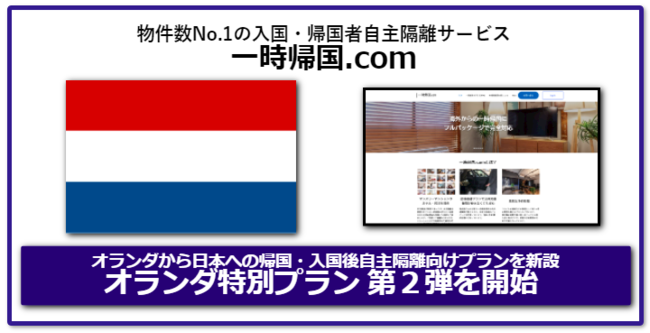 日本最大数の一時帰国向け自主隔離物件を提供、帰国者受入数No.1(※1)のmatsuri technologies株式会社(本社東京都新宿区、以下 matsuri technologies)はこのたび、オランダからの一時帰国者様向けに、「一時帰国.com」において「オランダ特別プラン」を開始します。