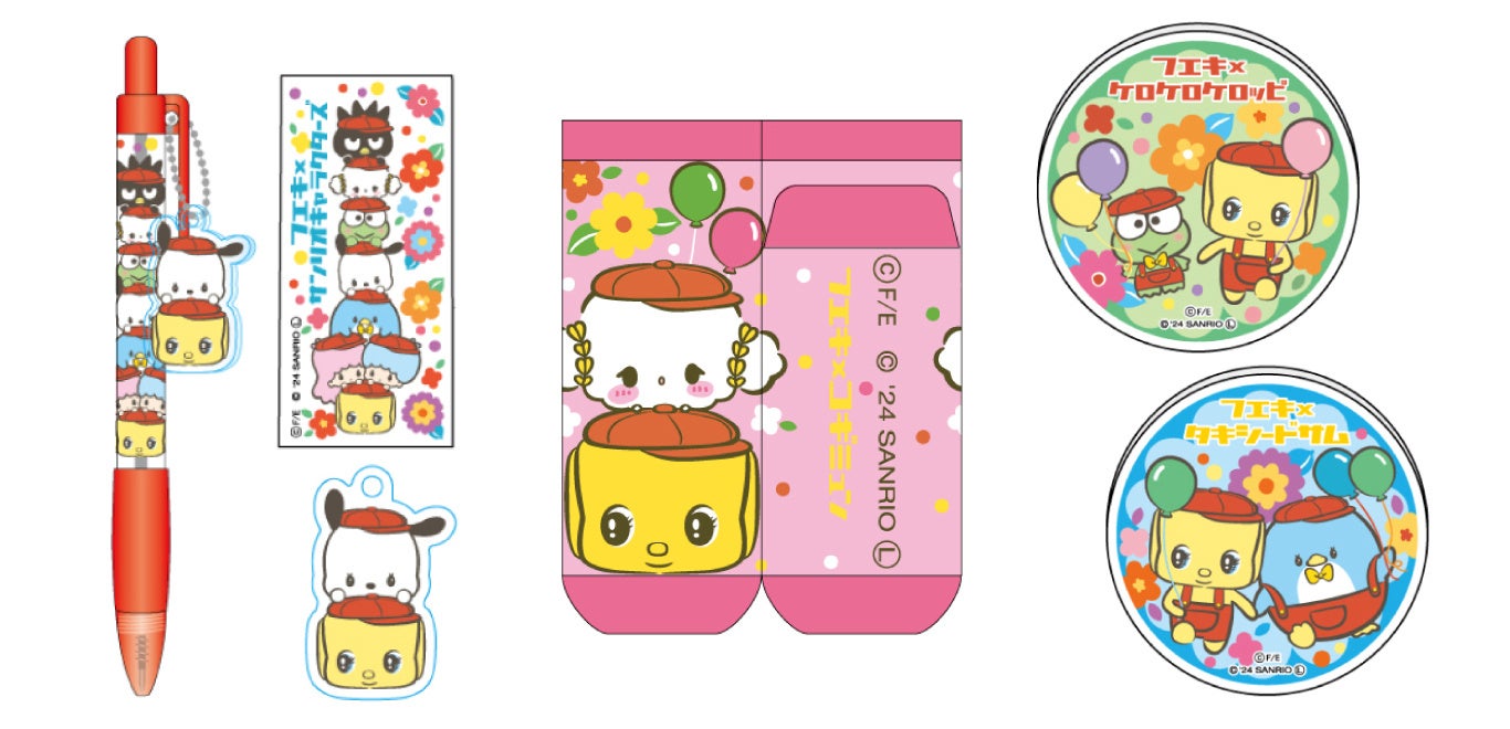 オリジナル商品の企画・制作・販売を軸に、企業・組織のトータルブランディングを手掛ける株式会社ヘソプロダクション(本社:大阪市福島区・代表取締役:稲本ミノル)は、不易糊工業株式会社の「フエキくん」と、株式会社サンリオの「サンリオキャラクターズ」がコラボレーションした「アクリルパーツ付ボールペン」「靴下」「アクリルマグネット」を、2024年11月上旬より順次販売開始いたします。