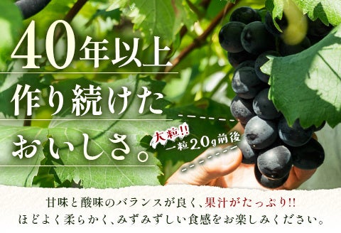 果肉がやわらかく、酸味が少ないぶどうです。さらに滴るほど果汁が多く、甘くて濃い味わいが特徴。
