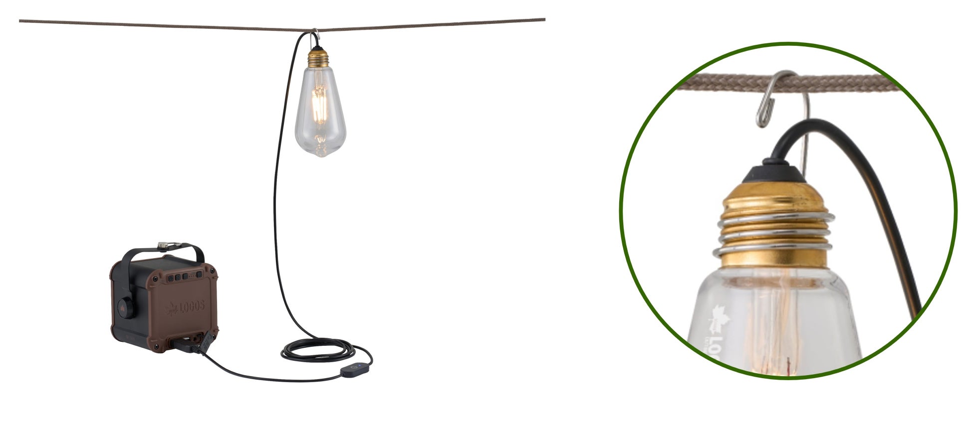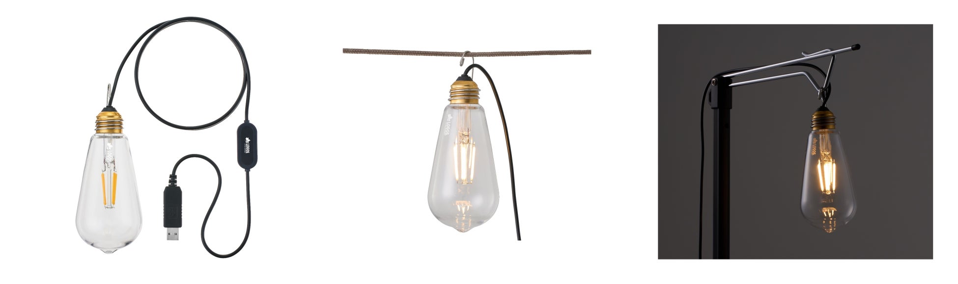 またUSB電源式のため、別売りのパワーストックランランやUSB機器、市販のモバイルバッテリーに接続すれば点灯するほか、本体にフックが付いており吊り下げもスムーズなので、使い勝手に優れています。