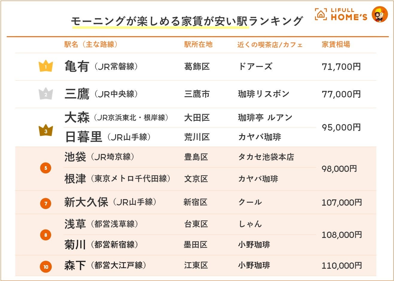 モーニングが楽しめる家賃の安い駅ランキングをLIFULL HOME'Sが発表