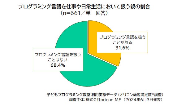 つづいて、プログラミング教室に通っている(いた)子どもの家庭環境を把握する目的の設問として、両親のどちらかが「プログラミング言語を仕事や日常生活で扱うか」について聴取したところ、「プログラミング言語を扱うことがある」と回答した割合は31.6%となりました。