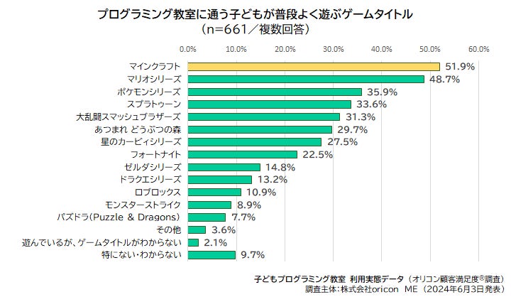 つづいて、「教室に通っている(いた)子どもがよく遊ぶゲームタイトル」について聴取したところ、略称“マイクラ”として親しまれているゲーム「マインクラフト(Minecraft)」が最も多く51.9%、次いで「マリオシリーズ」が48.7%、「ポケモンシリーズ」が35.9%と続きました。人気ゲームシリーズをおさえ、プログラミング教材としても活用されているゲームの人気の高さがうかがえる結果となりました。