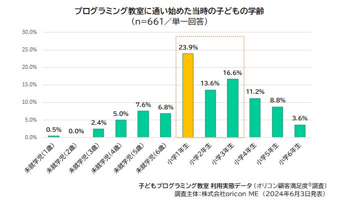 2024年 『子どもプログラミング教室』 利用実態データ|教室に通い始めた学齢は「小学1年生」が最多 23.9%(オリコン顧客満足度®調査)