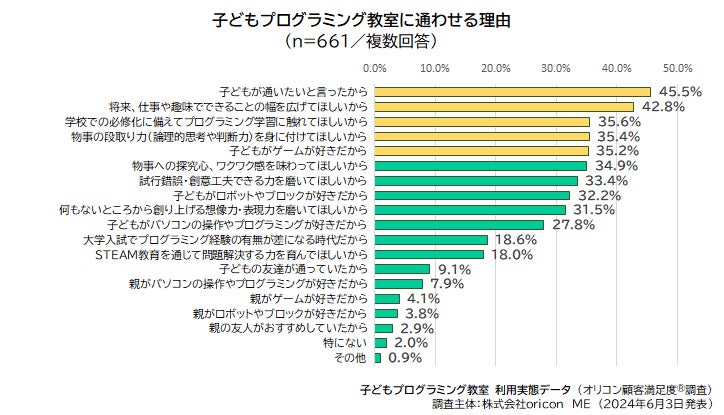 「子どもプログラミング教室に通わせている(いた)理由」については、「子どもが通いたいと言ったから」が45.5%と最も多く、次いで「将来、仕事や趣味でできることの幅を広げてほしいから」が42.8%、「学校での必修化に備えてプログラミング学習に触れてほしいから」が35.6%、「物事の段取り力(論理的思考や判断力)を身に付けてほしいから」が35.4%、また、「子どもがゲーム好きだから」も35.2%で上位の理由に見られました。