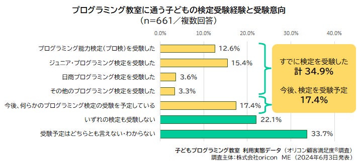 最後に、「各種プログラミング能力検定の受験経験の有無」について聴取したところ、プログラミング教室に通っている(通っていた)子どもの受験経験は合計で34.9%となりました。「今後、受験する予定」の17.4%とあわせると、合計で52.3%と過半数がプログラミング能力検定の受験を視野に入れている事が伺える結果となりました。
